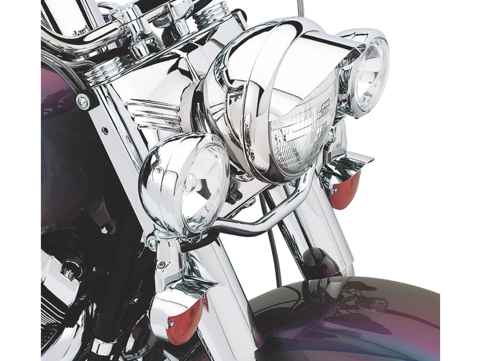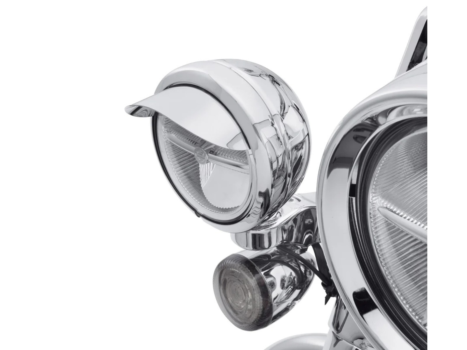 These chrome visors are the ideal complement to the classic main headlamp visor, giving your auxiliary lamps the same refined and unified appearance. They fully wrap around the auxiliary lamps for a clean, cohesive look. Sold as a pair and compatible with all auxiliary lamps – models from ’87 onward require trim ring P/N 68775-93TA. Not compatible with trim rings P/N 69622-99B or 69732-05.