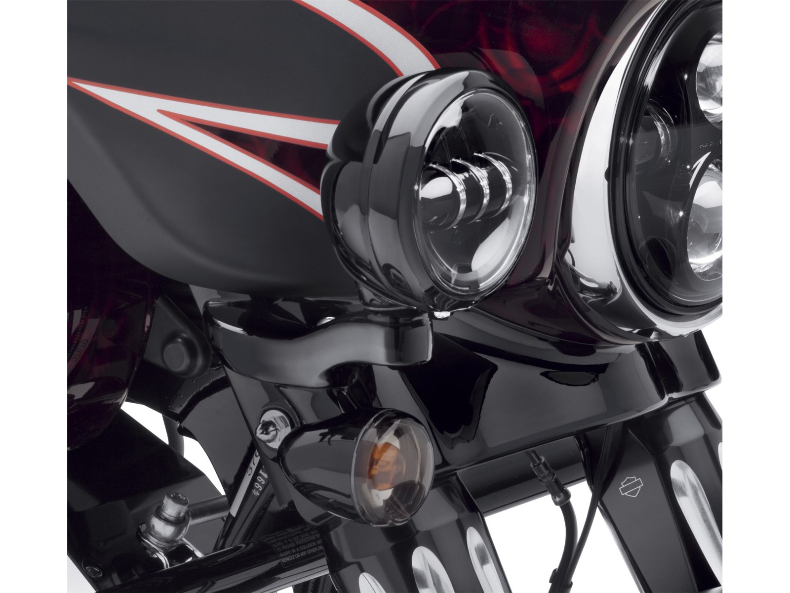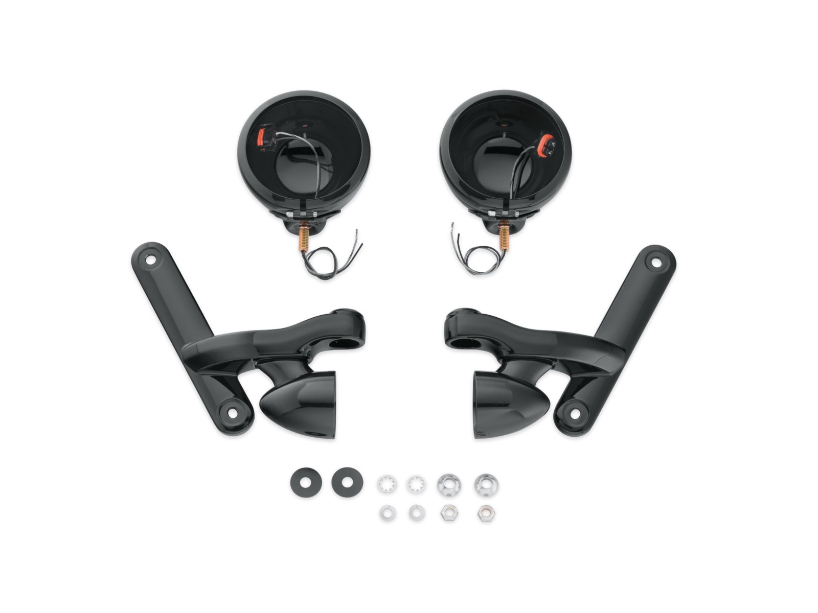 Fits '14-later FLHT, FLHTK, FLHTCU, FLHX, FLHXS and FLHXST models. Kit includes passing lamp housings, retaining rings, mounting brackets, bullet turn signals, auxiliary lamp switch and hardware. Auxiliary Lamp Bulbs sold separately.