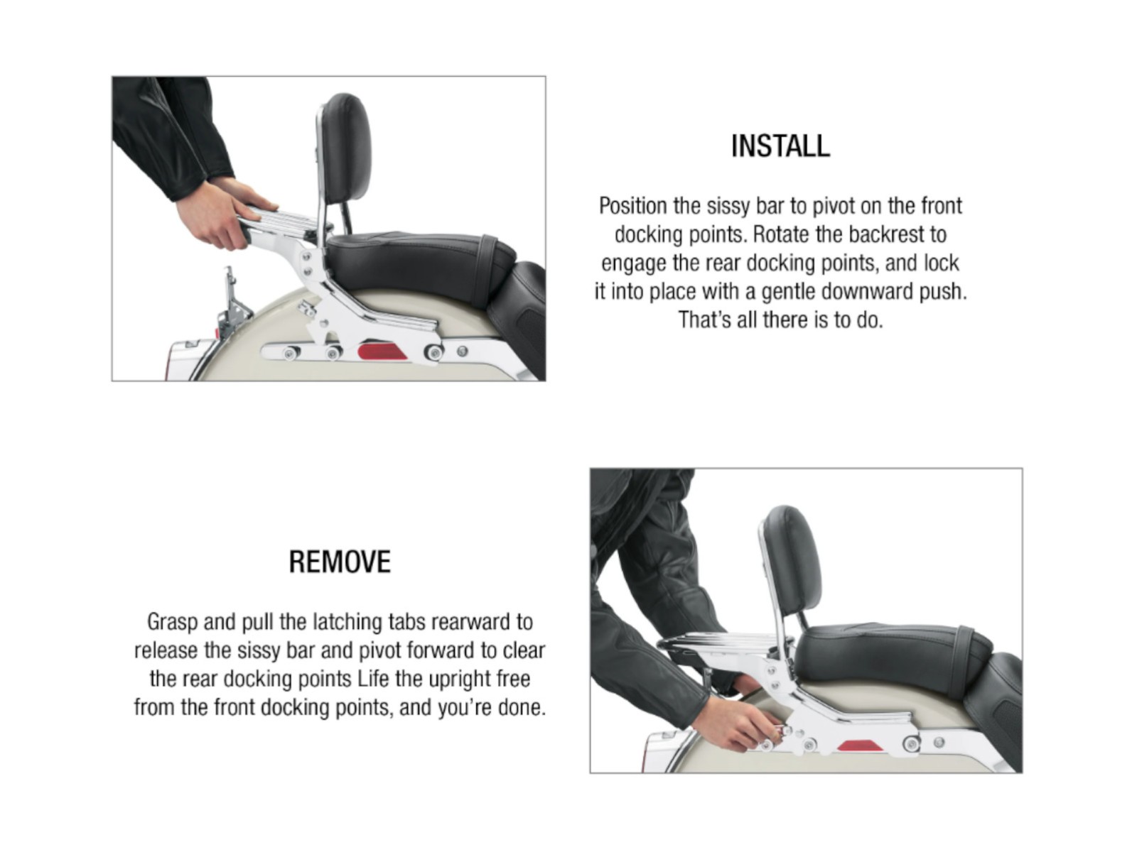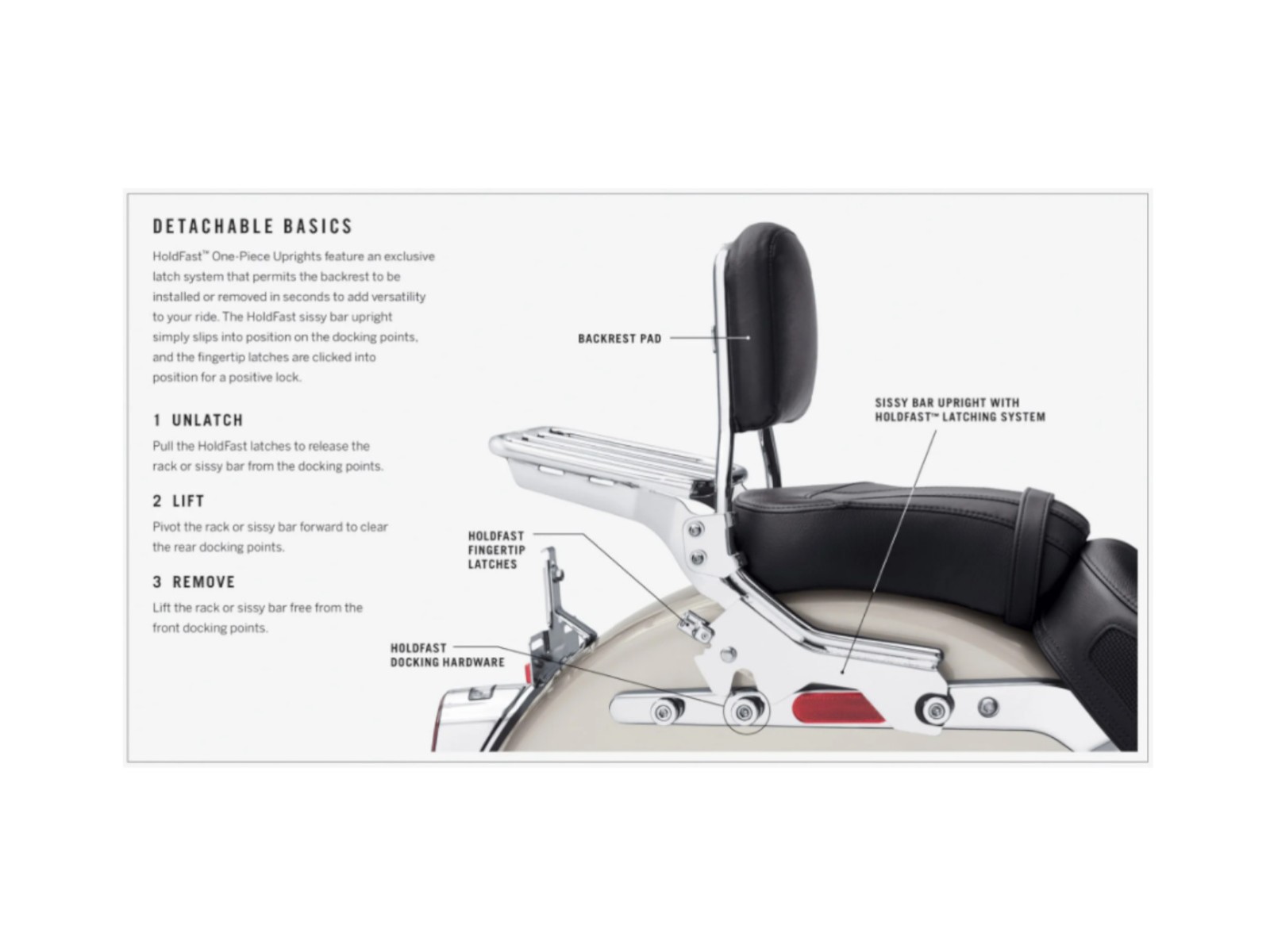The perfect start to transforming your motorcycle into a touring machine. The backrest provides the passenger with a comfortable seating position and a feeling of increased security on long rides. The one-piece HoldFast™ uprights feature an exclusive locking system that allows the backrest to be installed or removed in seconds. The HoldFast sissy bar upright simply slides into place using the mounting points, and the fingertip-operated latches lock into place for a positive lock.