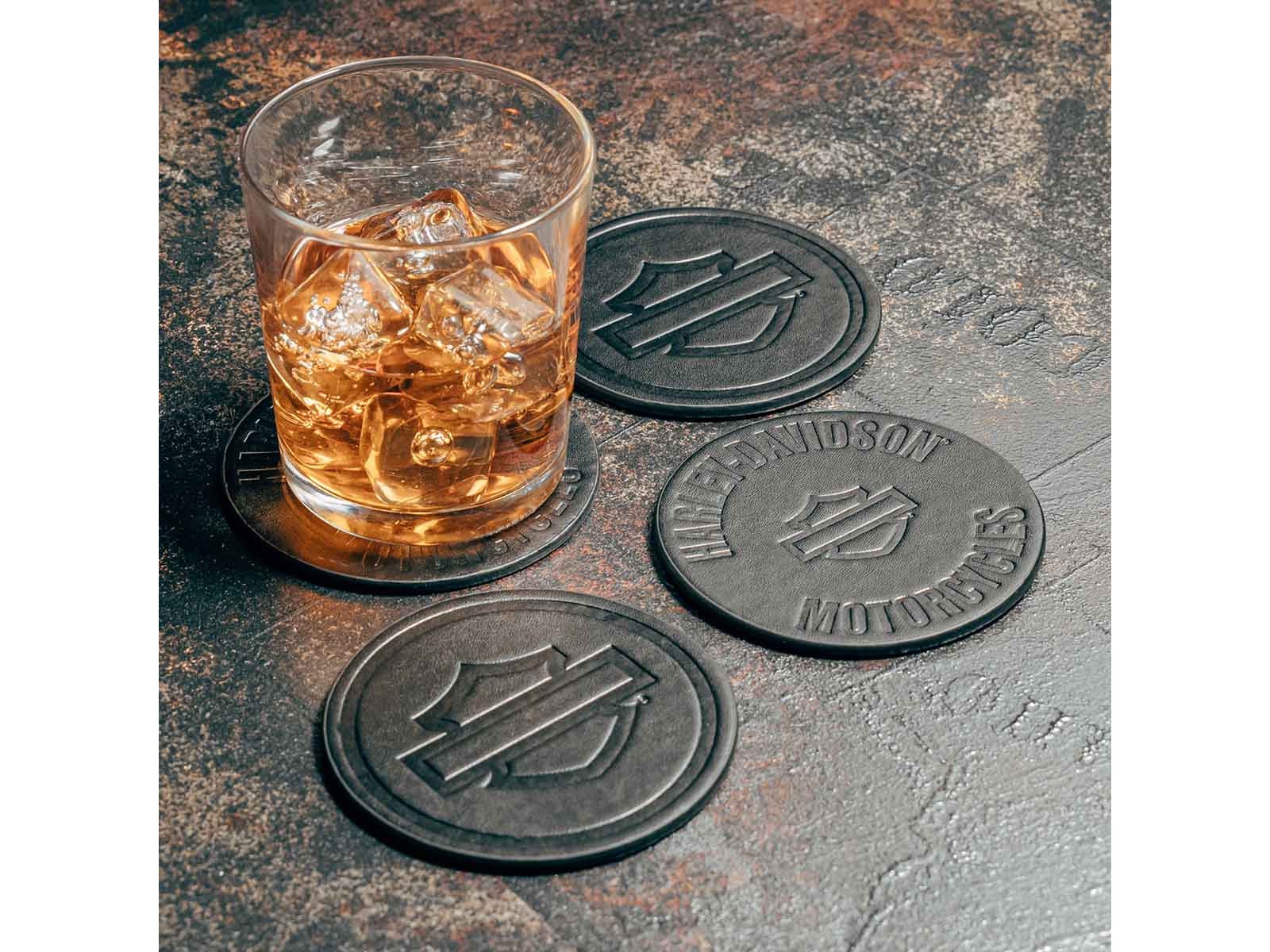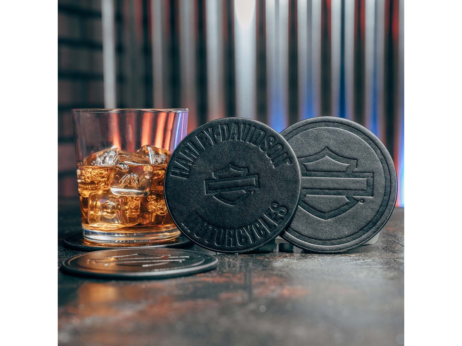 Set of four coasters made of imitation leather with embossed logos. Two with Open Bar & Shield and two with Harley-Davidson® motorcycles.