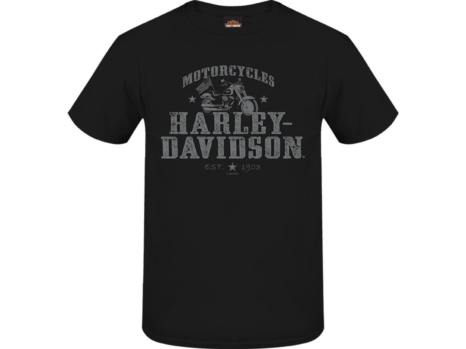- Black dealer T-shirt with Fat Boy print and Harley-Davidson lettering.