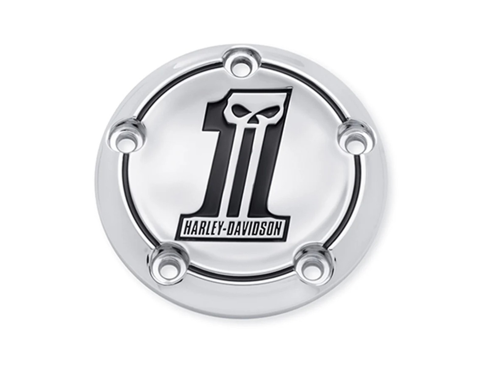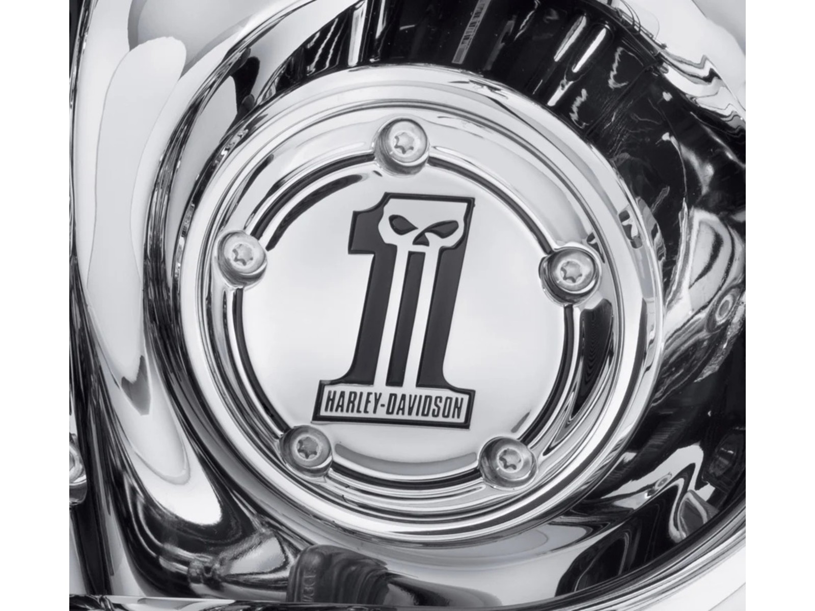 Give your bike a bold look for a night in the city with the dark Harley-Davidson® #1 Skull design. Made from premium die-cast aluminum, polished and chrome-plated for brilliant shine. The black-filled racing stripes and Dark Custom™ Skull create striking contrast and added depth. Recessed mounting holes enhance the refined finish. Includes chrome-plated stainless steel mounting hardware. Fits Twin-Cam models from 1999 to 2017.