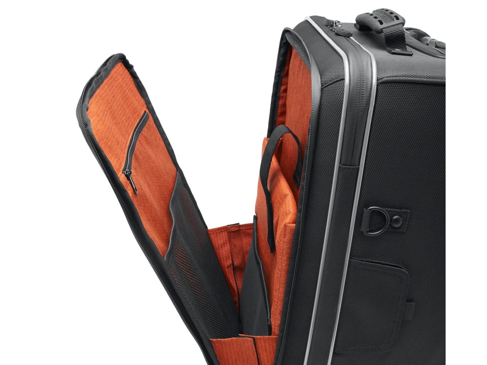 - High-contrast orange interior enhances visibility, with multiple inner and outer pockets and an adjustable main compartment for organized packing.