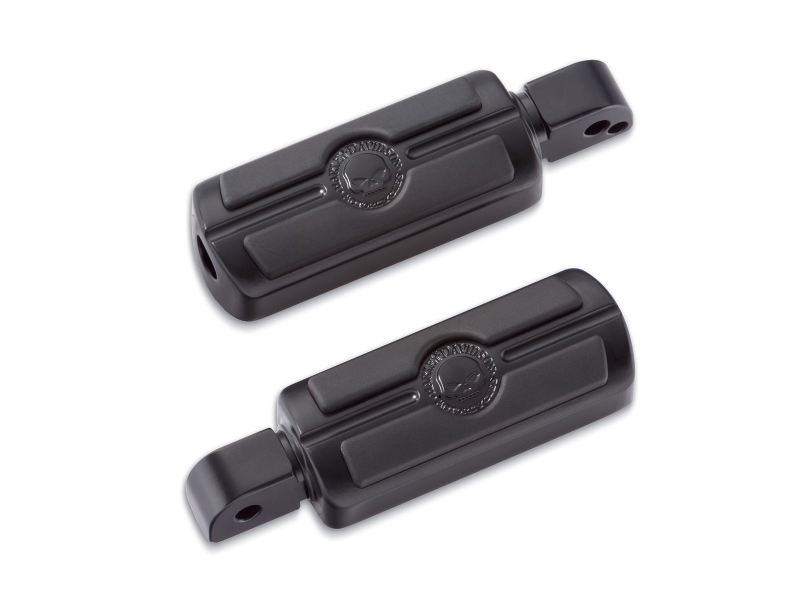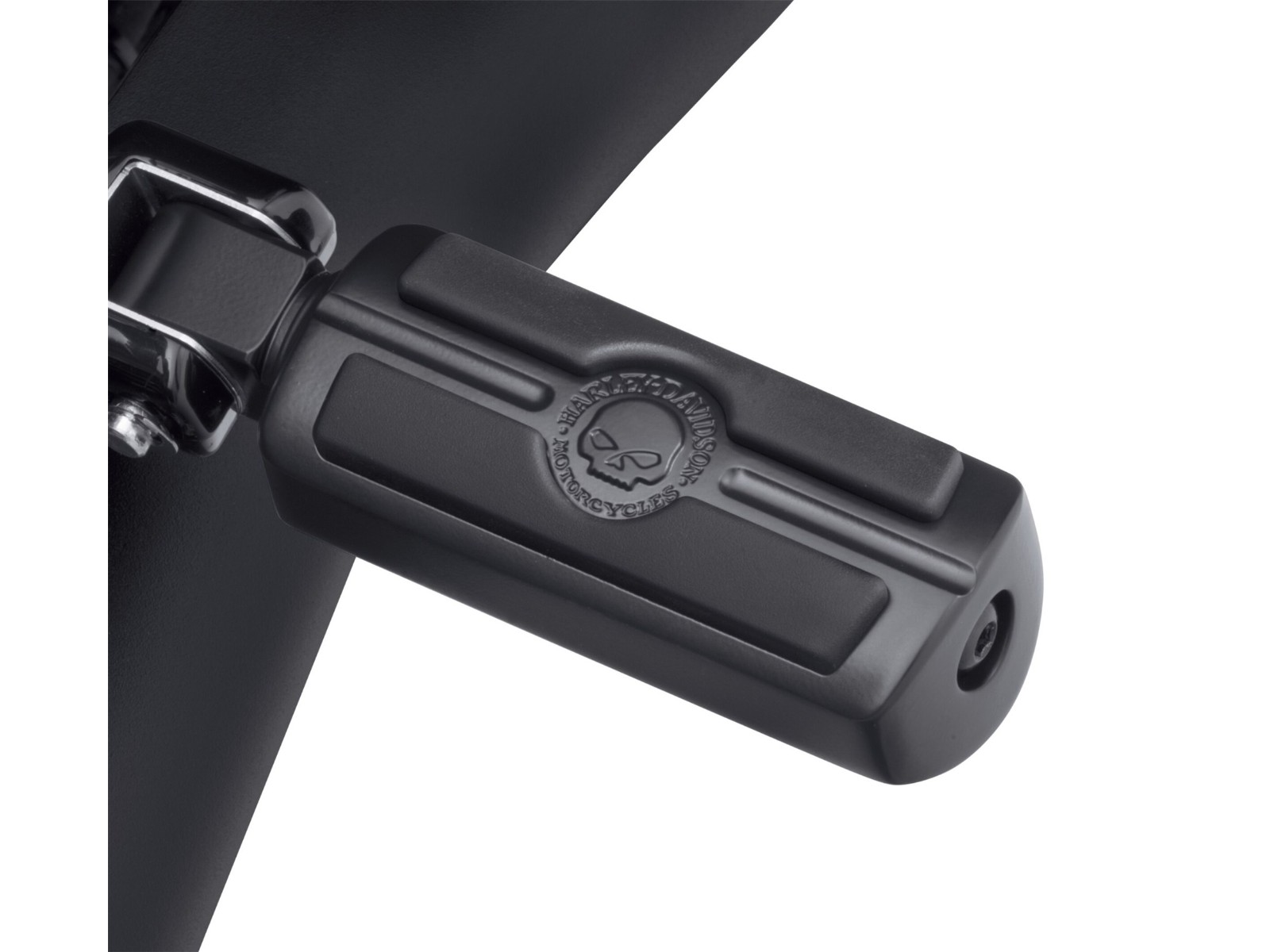 Dark style meets iconic attitude. These obsidian black passenger footpegs from the Willie G Skull Collection feature a raised skull logo and Harley-Davidson Motorcycles script, surrounded by durable black rubber for grip and comfort.
