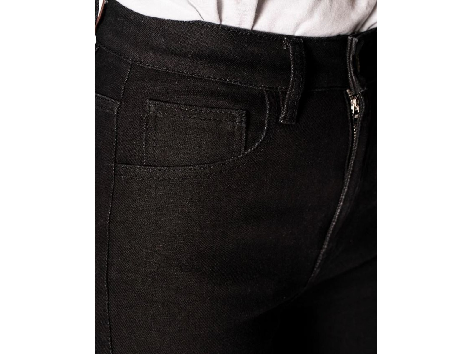 - Corte: Cintura alta con pernera estrecha y cierre de cremallera