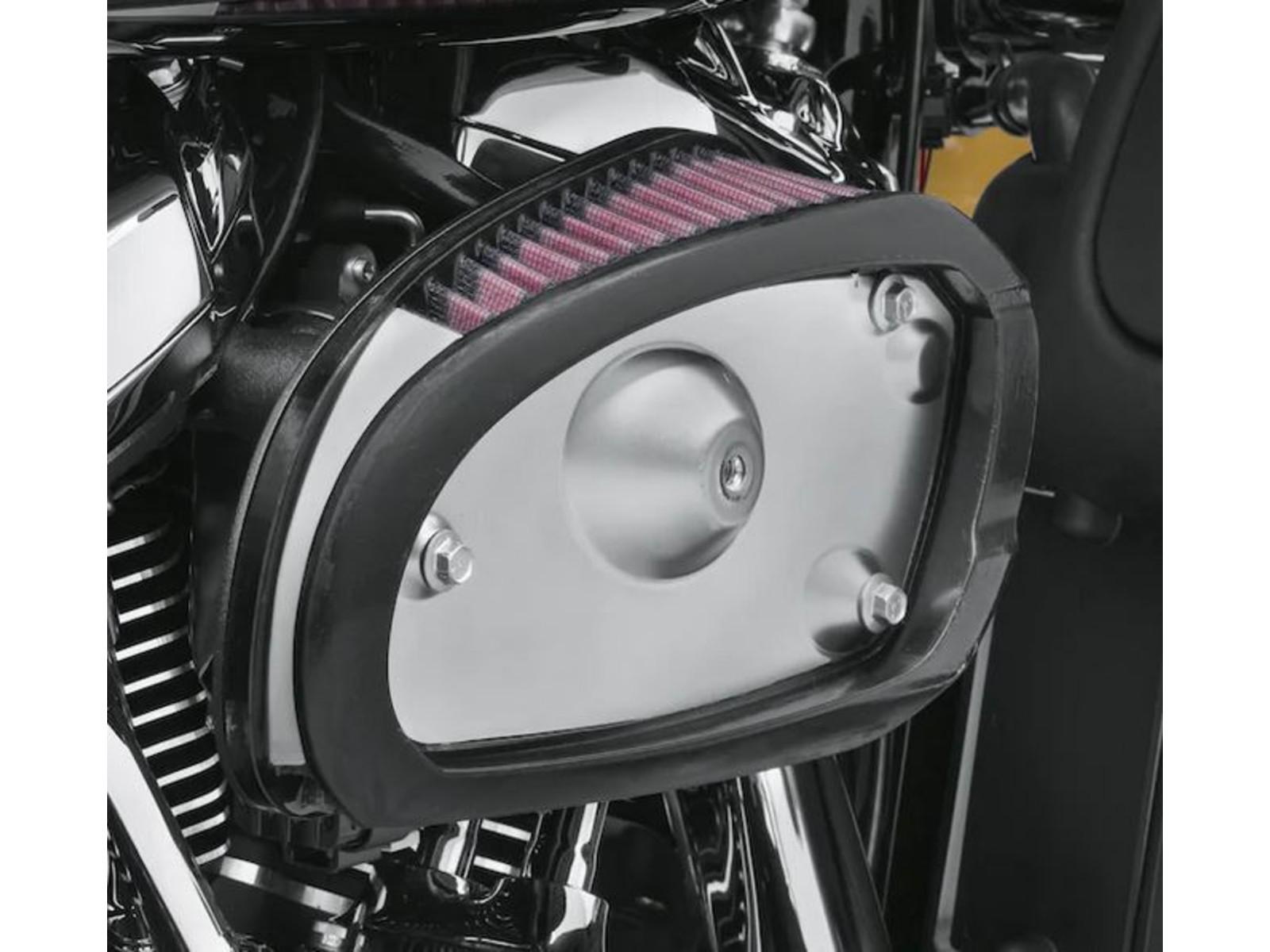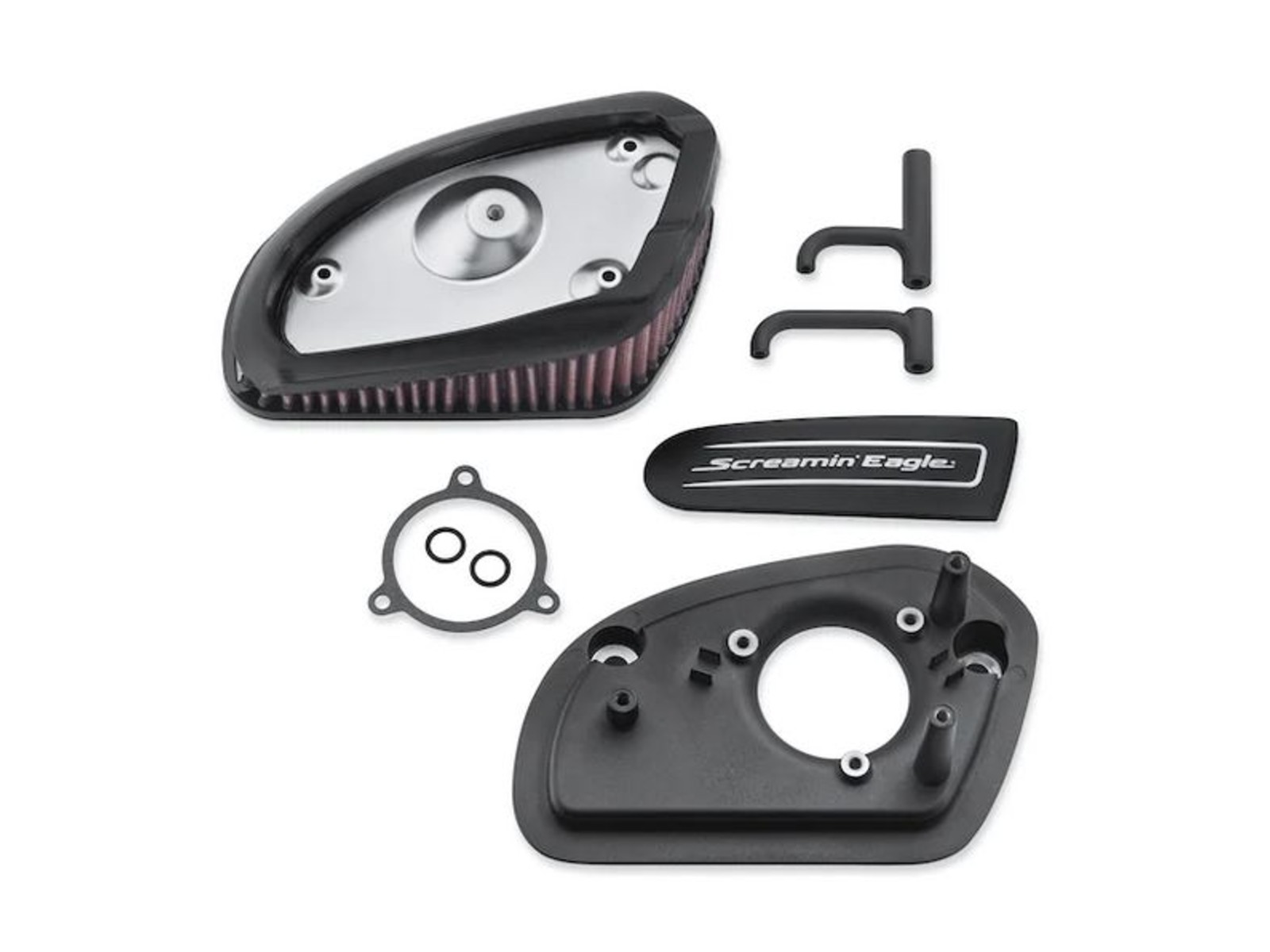 Le kit comprend la plaque d'appui moulée, un élément de filtre en coton huilé à haut débit, tous les joints d'installation, la visserie requise et un médaillon Screamin' Eagle à facettes diamant pour parfaire l'esthétique.