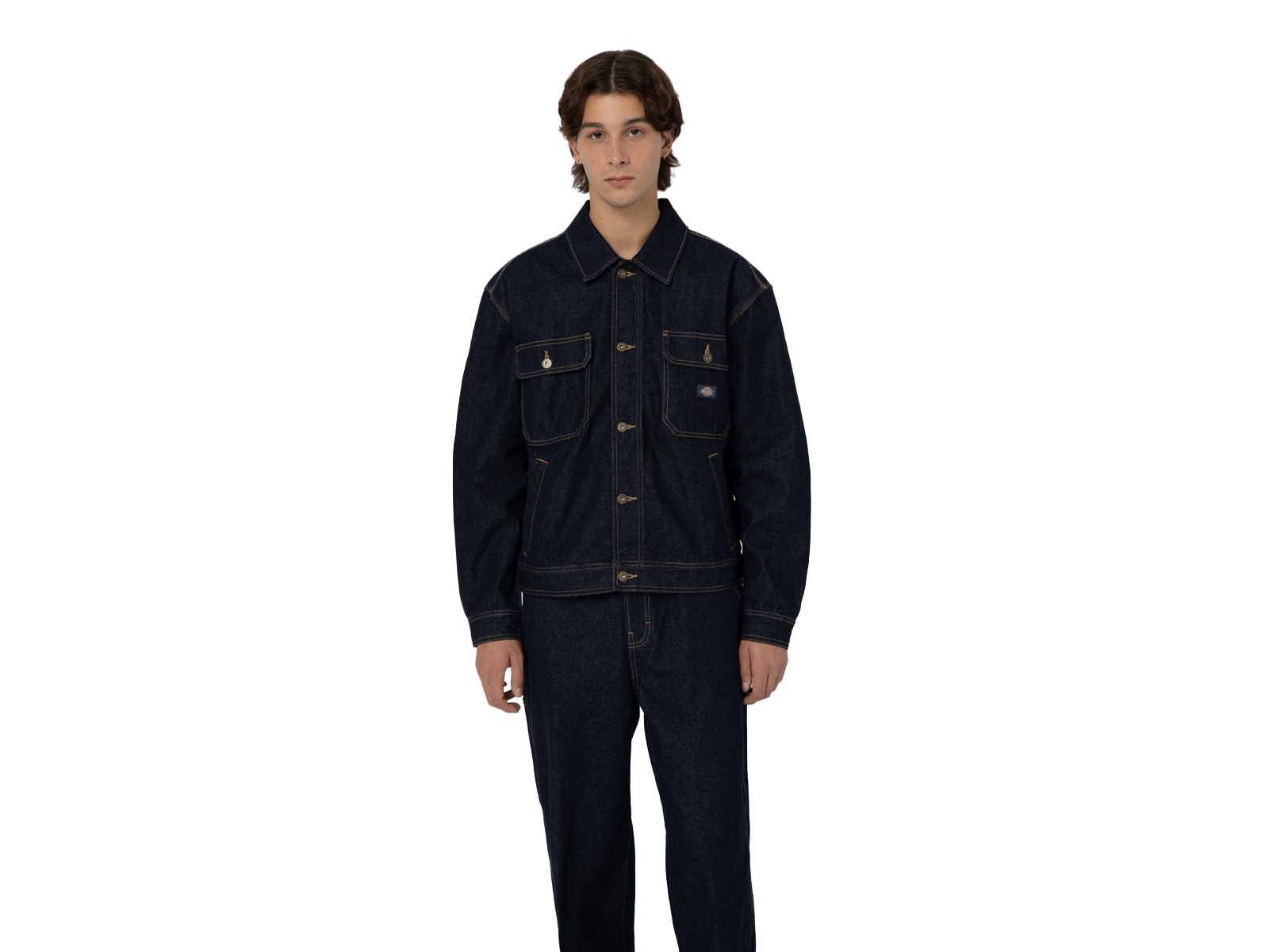 - Ein regulär geschnittenes, ungefüttertes Heritage-Stück mit Nieten-Knopfleiste, zwei Nieten-Brusttaschen mit Knopfleiste, zwei seitlichen Leistentaschen, gewebtem Dickies-Etikett, verstellbaren Manschetten und Bund.