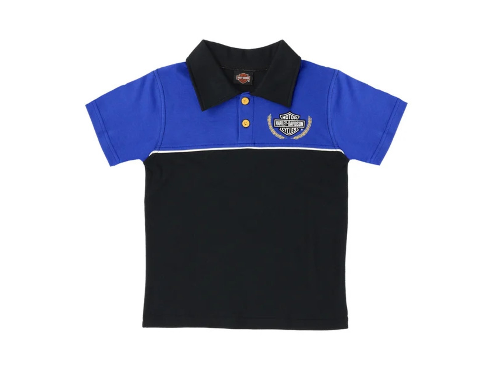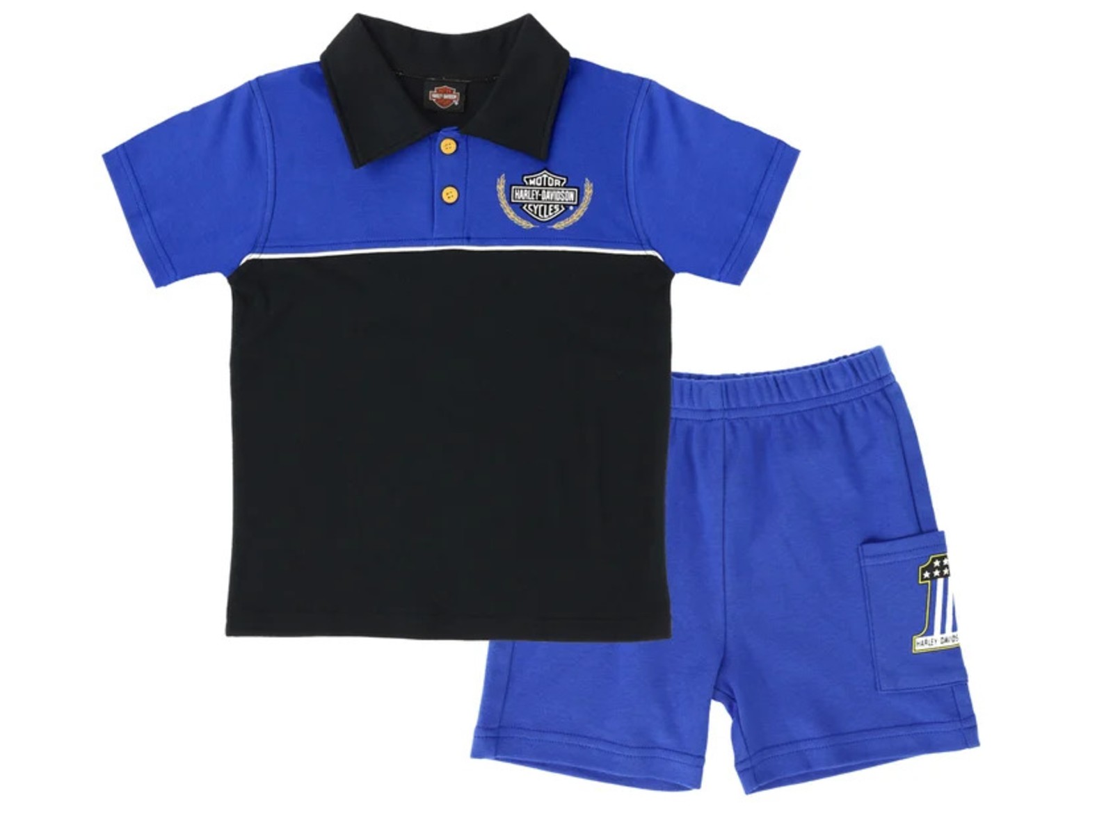 Ein toller Look für Jungen im Kleinkindalter: Dieses 2-tlg. superweiche Strickhemd hat eine Rugby-Kragenleiste mit H-D®-Logo, Kontrastpaspeln und Colorblocking sowie eine passende kurze Cargo-Tasche aus Strick. Beide Teile sind mit kultigen, von Rennen inspirierten Siebdruckgrafiken versehen.