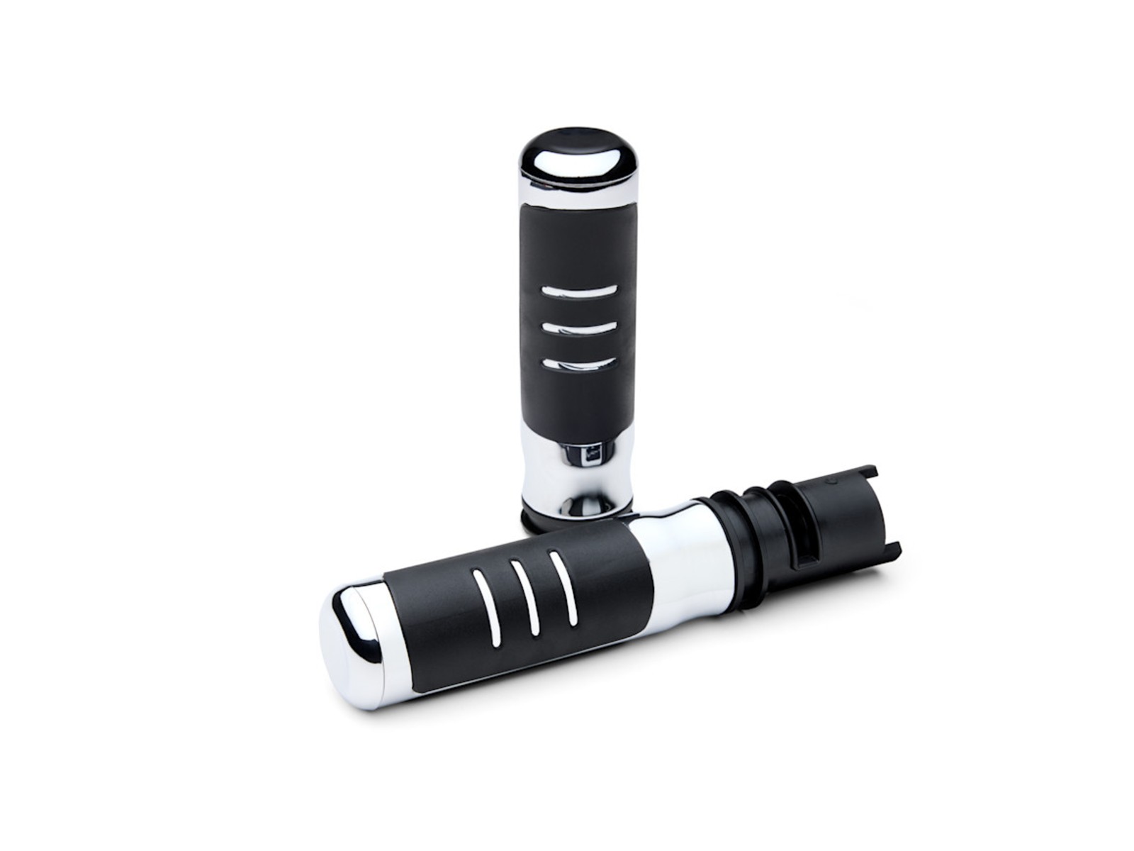 - Schwarze Gummigriffe mit drei erhabenen Chromstreifen und Chromfassung